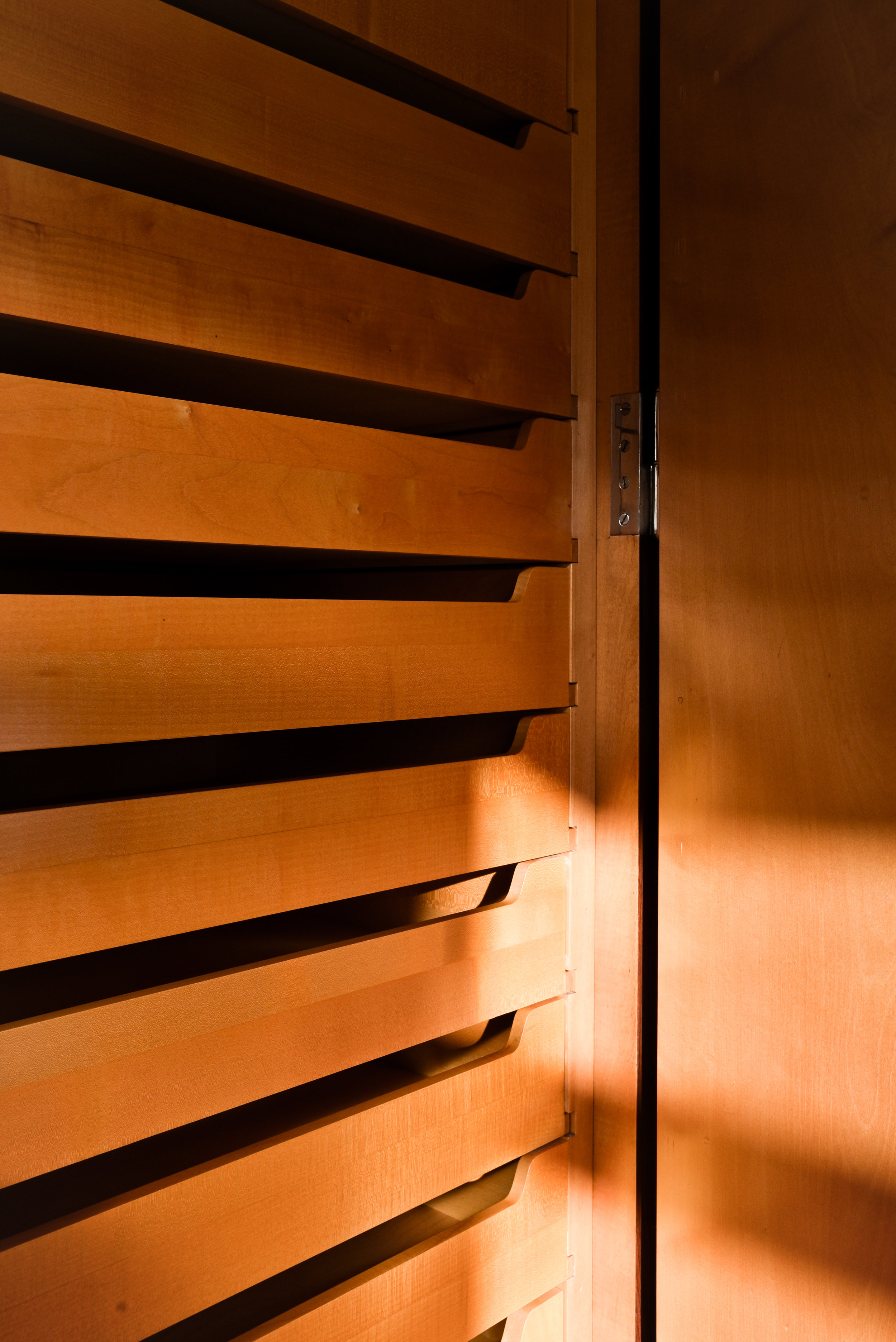 Do you remember the entry hall? In a similar fashion to Le Corbusier’s Maison la Roche, the architect pulls your eyes away from the stairways or corridors that lead to private rooms. In Maison la Roche it was the three-story cut out façade and second floor balcony that attracted your eye. Here it is that beautiful rosewood wall. It keeps the nonpublic entries discreet.