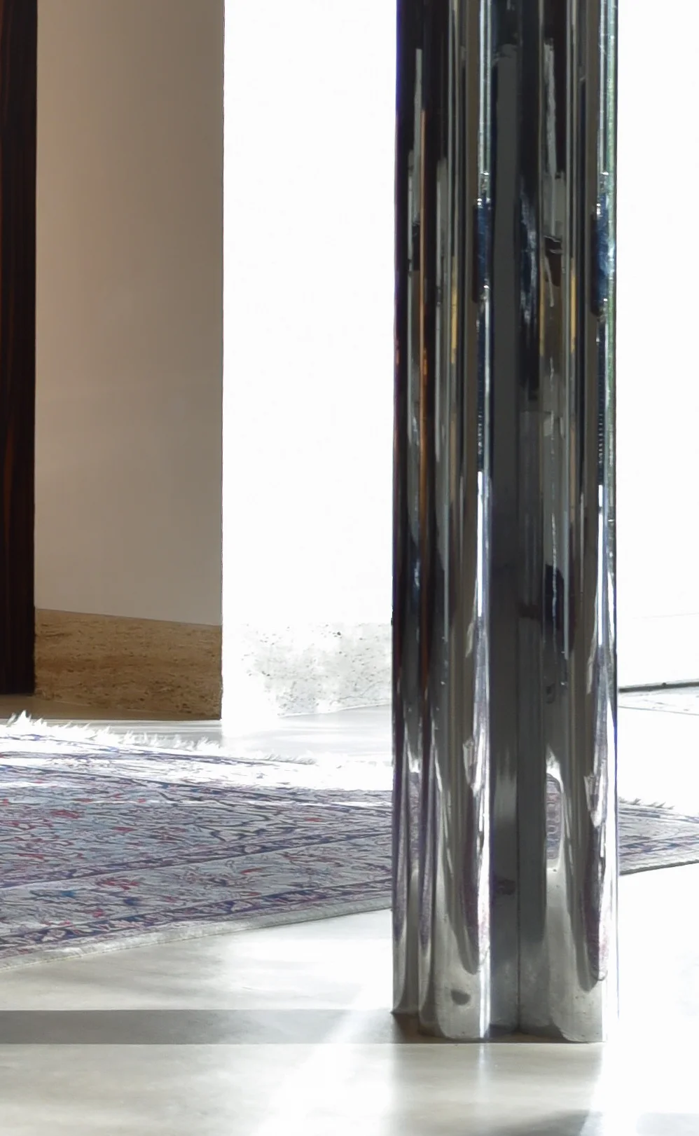The milk glazed wall, with its glossy exterior and frosted interior provides both privacy from the outside and allows for bright, soft light within. The staircase down to the main living space is enclosed inside the curve of the glass. The stairs continue with travertine tiles. The cross shaped column, here clad in chrome, repeats throughout the house and is part of the support structure that both Mies and the house is famous for. To the right a small corridor leading to the family’s private quarters.